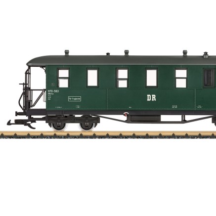 Passend zur Epoche der Dampflokomotive VII K rollt ein Gepäckwagen der DR aufs LGB-Gleis. Wagennummer ist die 974-102.