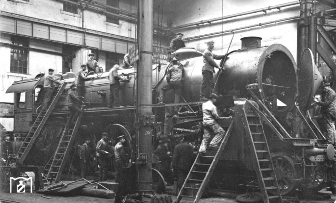 Viele Hände schaffen hier im wahrsten Sinne Großes. In Chemnitz entsteht die erste XX HV mit der Betriebsnummer 66 und der historischen Fabriknummer 4000. © Werkfoto Maschinenfabrik Chemnitz / Slg. J.Glöckner / Eisenbahnstiftung