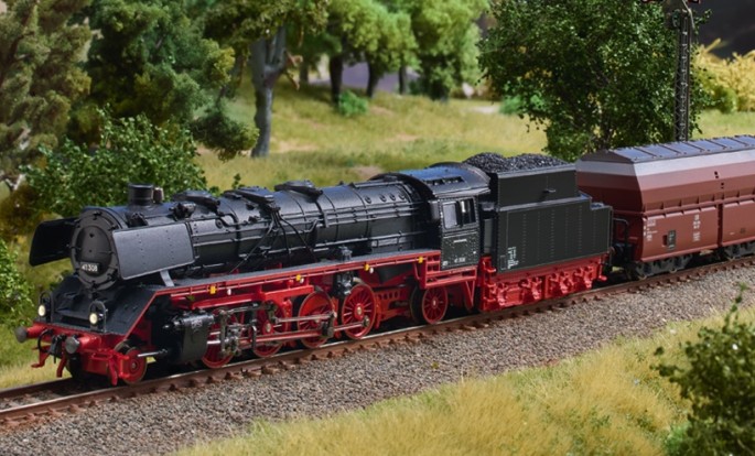 Das Modell der DB in Epoche III besitzt eine geschlossene Frontschürze und einen Altbaukessel. Fahrwerk von Lok und Tender sowie Tenderaufbau sind aus Metalldruckguss. Rauchkammertür zum öffnen.