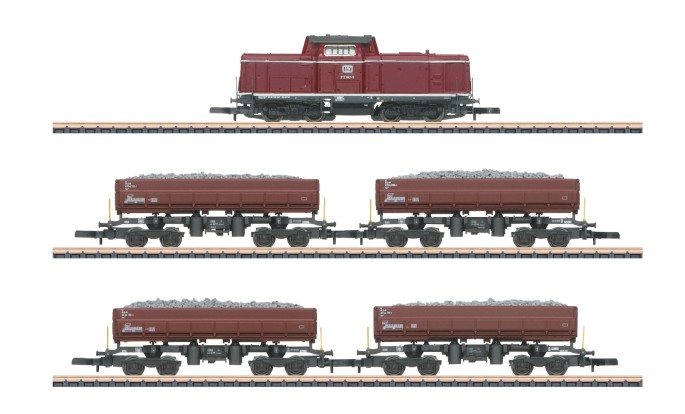 Das Zugset beinhaltet neben der Diesellokomotive mit Glockenankermotor und LED-Spitzenbeleuchtung auch 4 Seitenkippwagen des Typs Fas der DB AG. Die Wagen haben vorbildgerechte Schotterbeladung.